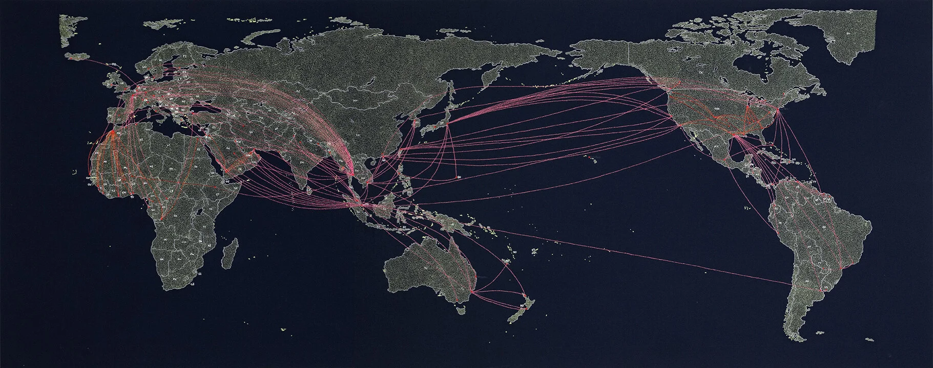 Reconstructing an exodus history: flight routes from camps and of ODP cases by Tiffany Chung (Vietnamese born 1969), 2017. Embroidery on fabric.