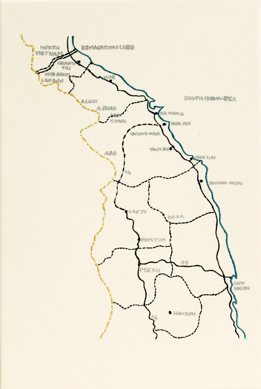 Stretching 40 feet across the wall, Chung’s thoroughly researched and plotted diagram comprises materials constructed through – and at times against – the archival: found and personal photographs, hand-drawn and embroidered maps, video footage, and texts. This diagram is Chung’s most biographical work to date, tracing her father’s footsteps as a helicopter pilot in an elite squadron of the South Vietnamese Air Force prior to being taken prisoner in Laos and kept in prison camps enforced with hard labor in North Việt Nam for 14 years. The detailed diagram documents her father’s movements during the war along with historical events and abandoned sites related to major battles that affected his fate, all interspersed with poetic texts depicting a parallel sequence of events in Chung’s own journey while piecing it together. As documentary route map, historical timeline, and personal scrapbook, the installation draws our attention to how individual memories intersect with larger historical narratives – the kind of personal histories relegated to the margins of public memory and social consciousness for the most part, in yield to the grand history that often shapes our world views.